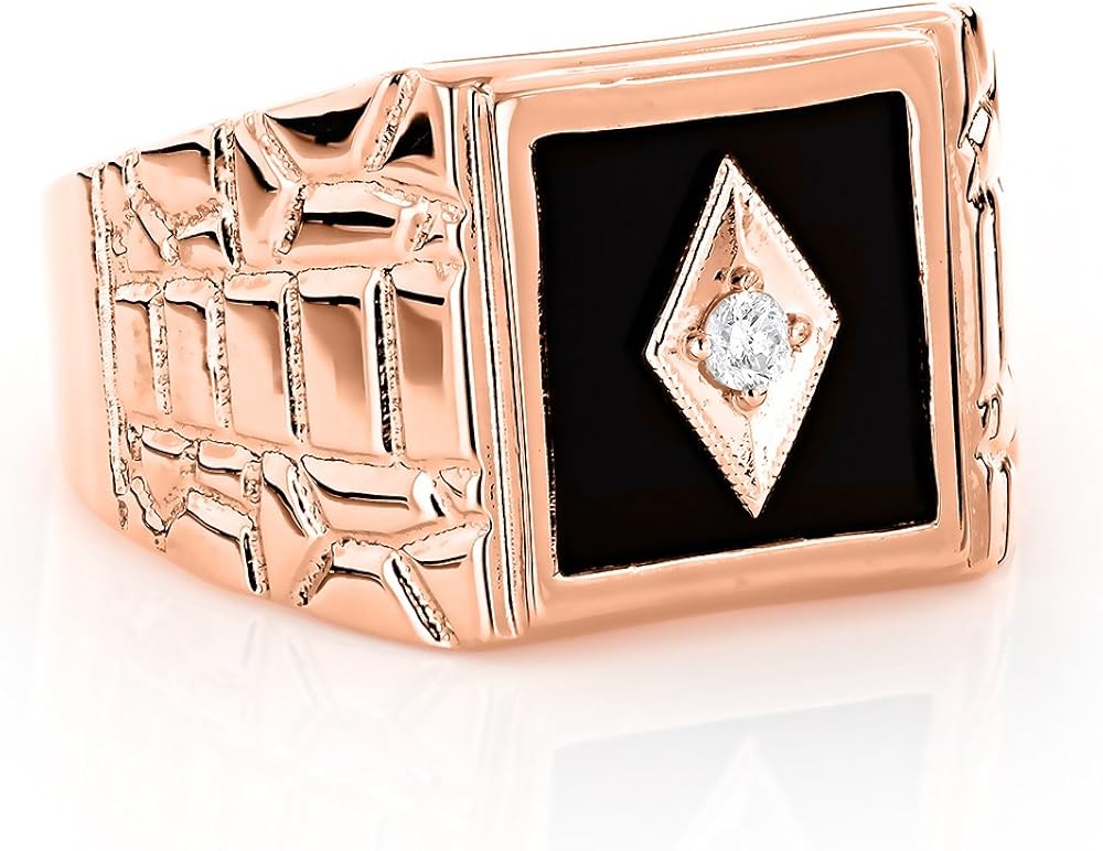 •genuine black onyx stone is used as gemstone. All of the items below are available in 14k white gold, 14k rose gold, and 14k yellow gold. This bold, very masculine black onyx and diamond mens ring is sure to impress. The ring is crafted in your choice of 10k, 14k or 18k solid yellow, rose, black or white gold, or sterling.